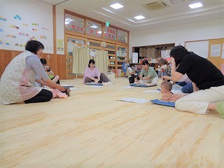 最後に大型絵本「だるまさんが」の絵本の時間・・・赤ちゃんたちはストレッチ~座談会の時間はスタッフとお利口さんに待っていてくれて、お話の時間はママに抱っこしてもらいながら楽しみました。