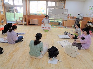 6月4日(水)に北御牧子育て支援センターで「ねんねの赤ちゃんひろば」が開催され、5組の親子の参加がありました。このひろばは生後1か月~4か月ぐらいまでの赤ちゃんとママの集まりです。