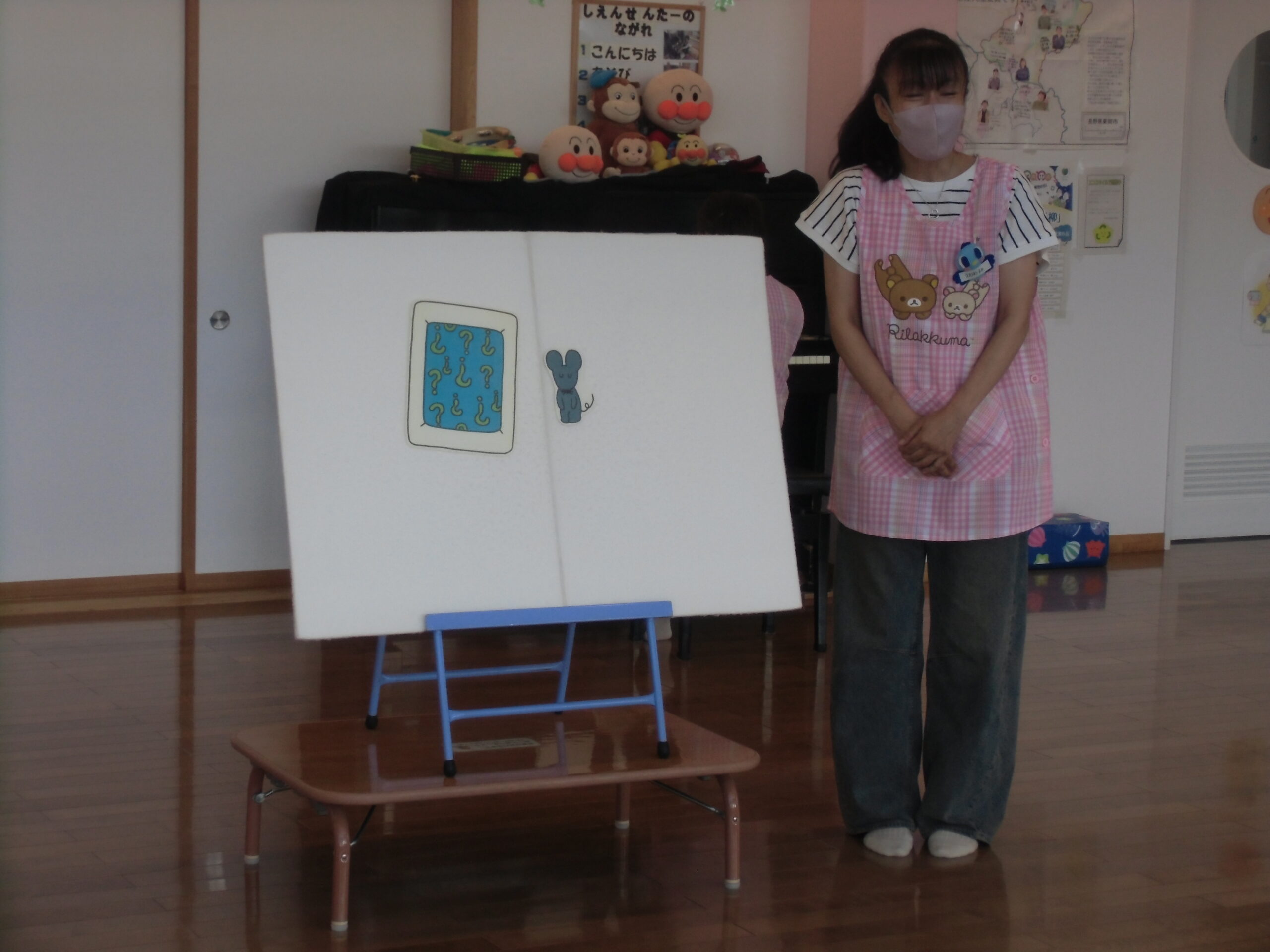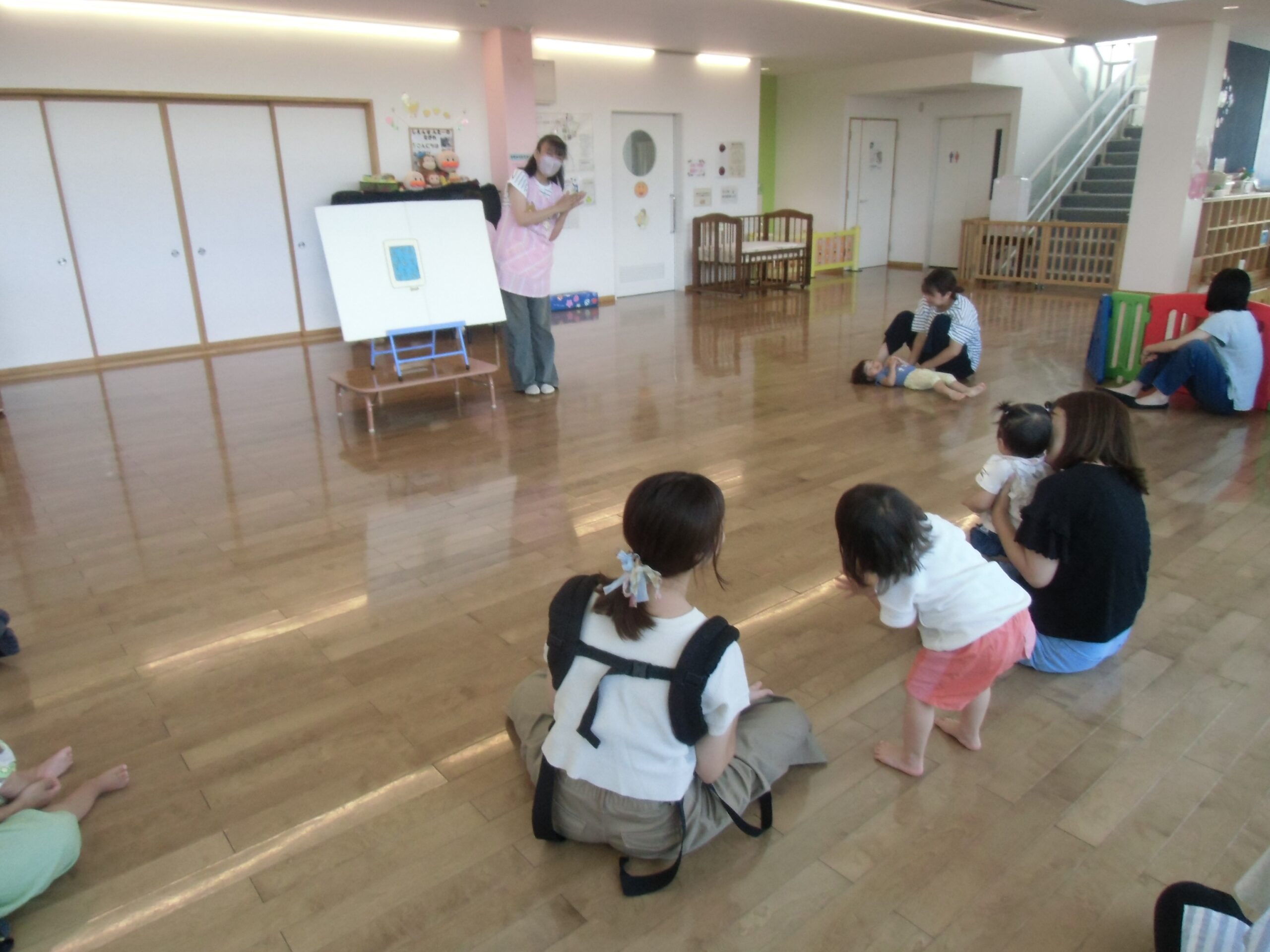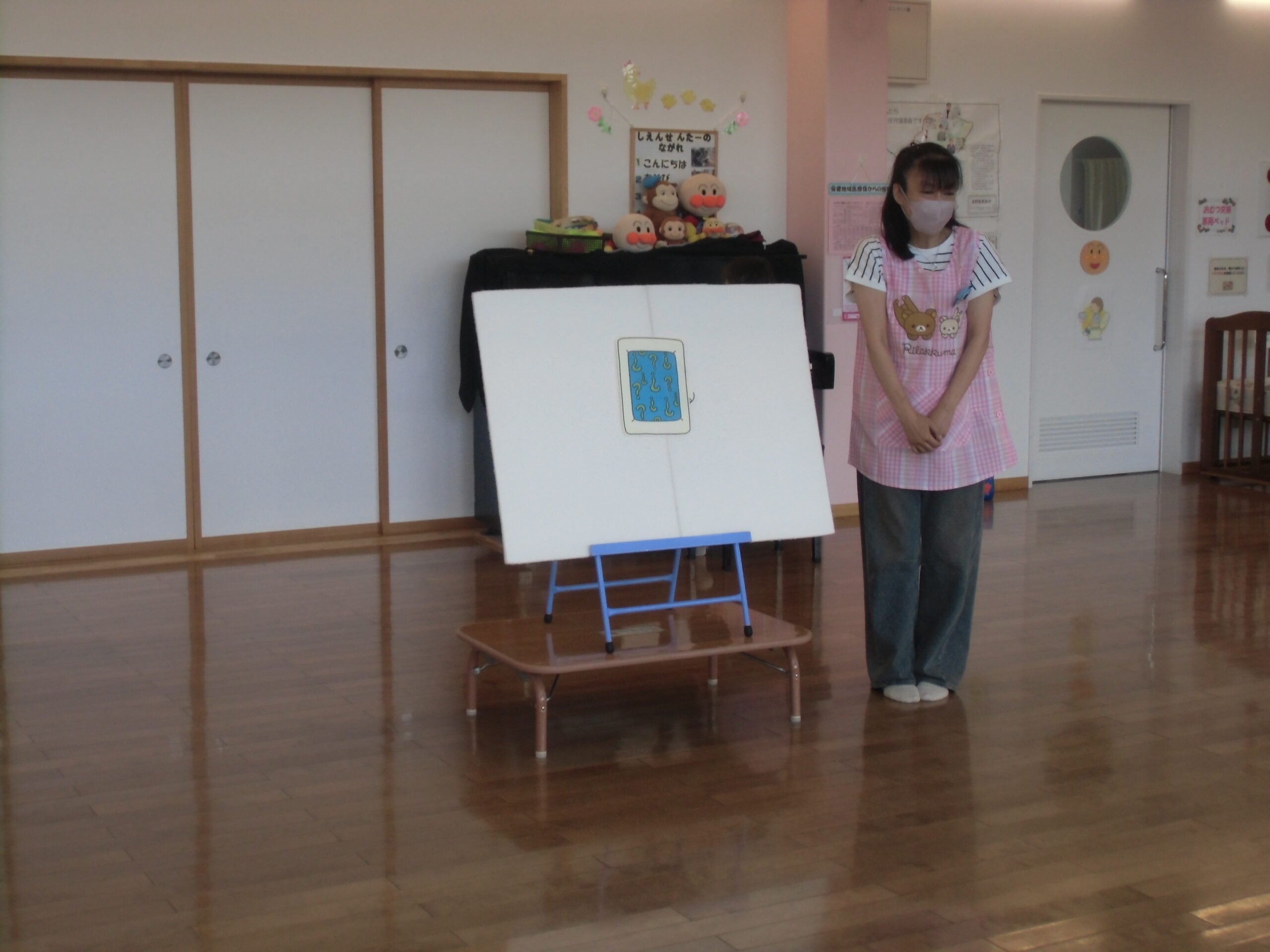 パネルシアター『だれがねむっているのかな?』お布団の中でねむっているのはだれなのかお布団から出ている部分をみてみんなで一緒に考えました。「おはよう~!」とでてきた『だれか』を見てあっ!と分かった表情をした子が何人かいました♪ママ~ずさんと一緒に体をゆらゆらしている子もいました♪