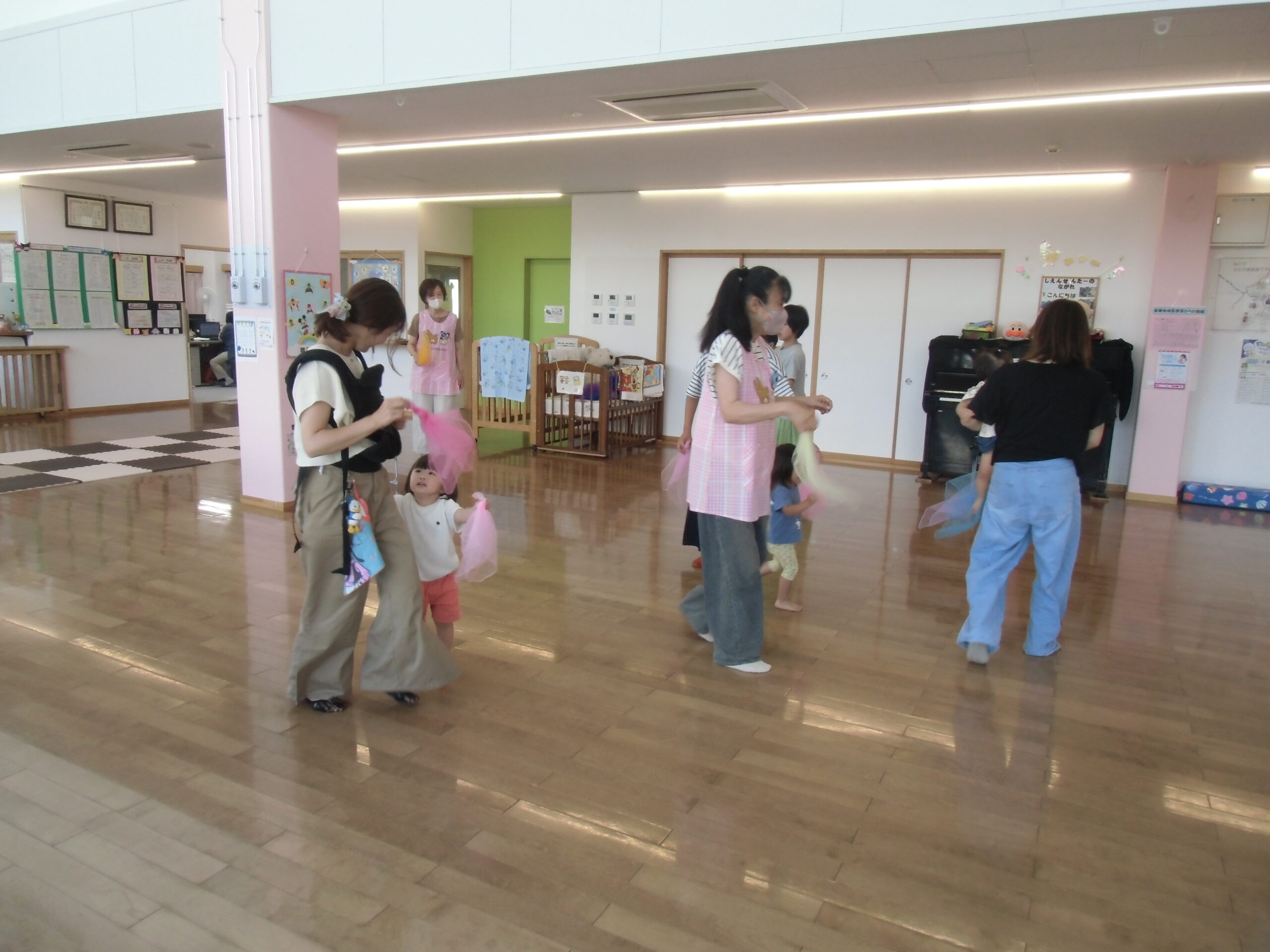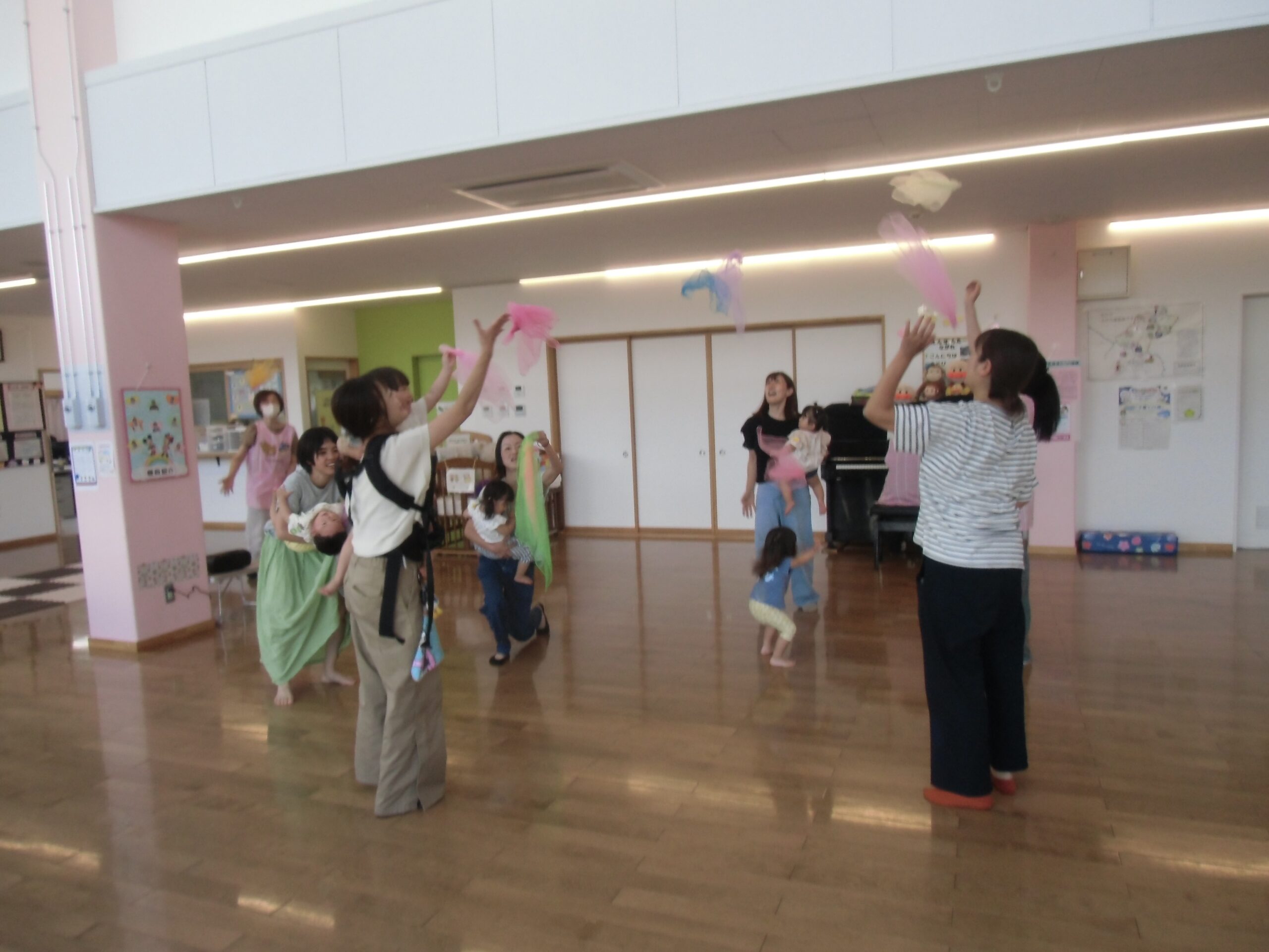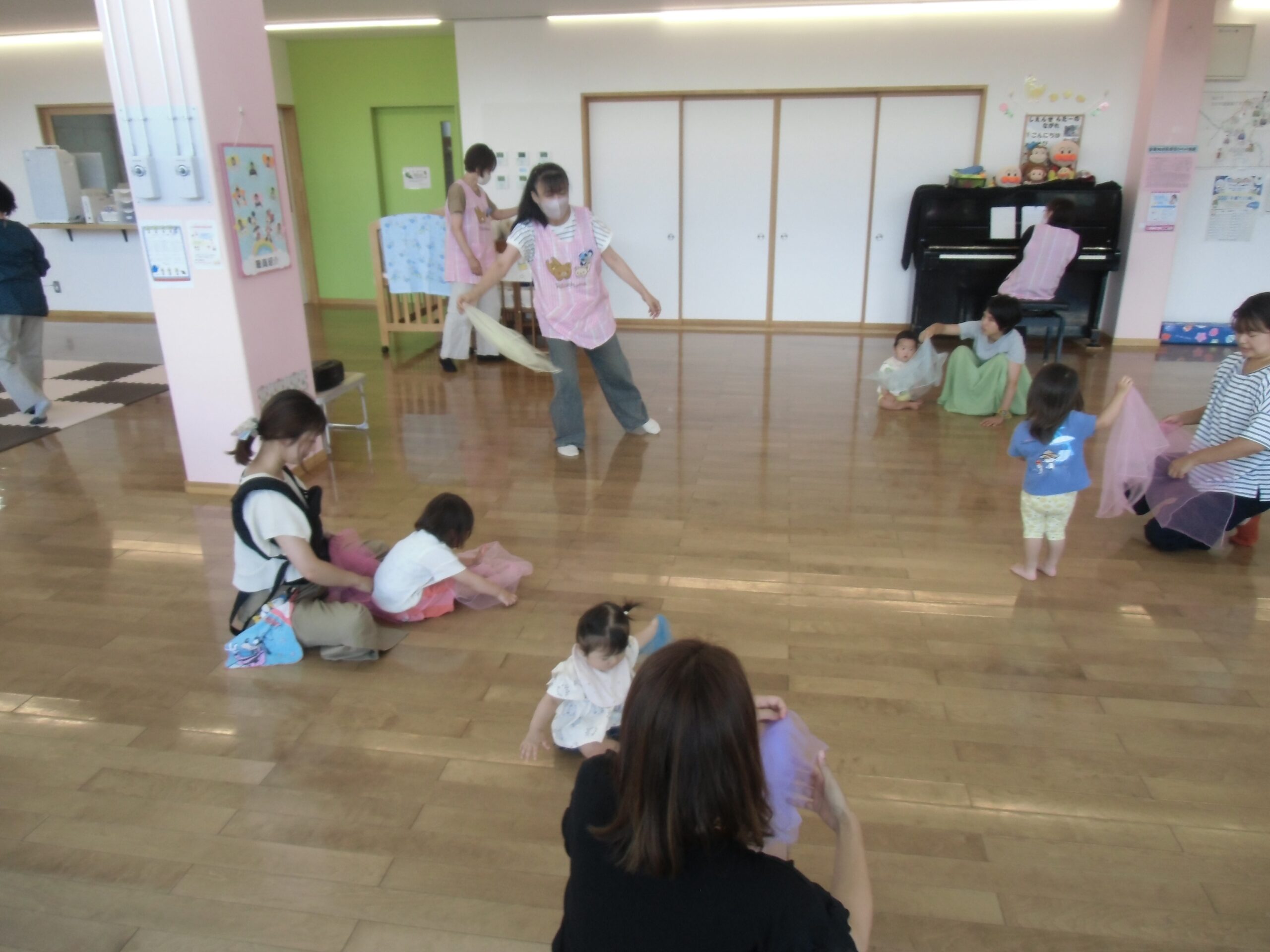 ママ~ずさんが集めてくれたお星さま(フラーフ)で遊びました♪ひらひらと揺らしたり、ピアノに合わせて歩いたり、音に合わせて高いところや低いところで揺らしたり…♪フラーフを使って感触遊びをたくさん楽しみました。