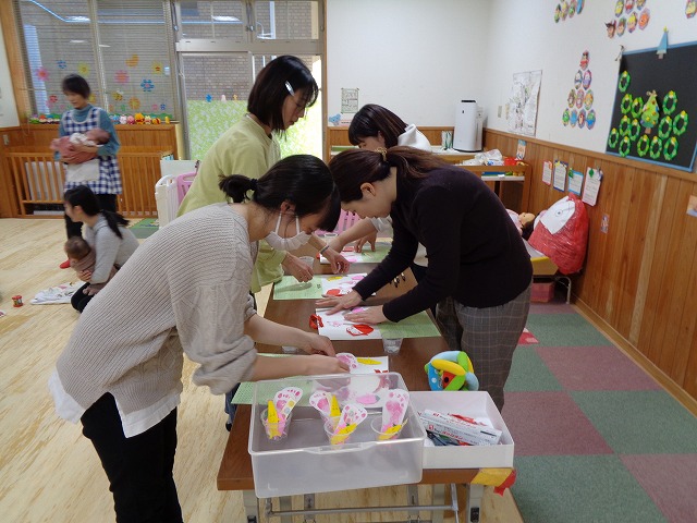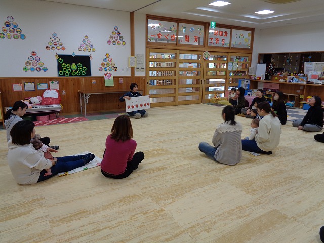 12月10日(水)に北御牧子育て支援センターでふれあいひろばが開催され、13組の親子の参加がありました。今回はふれあい遊びとカレンダー作りの内容で行いました。