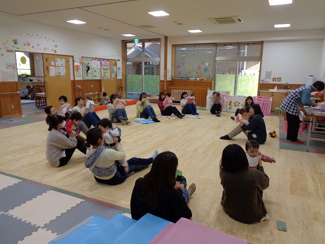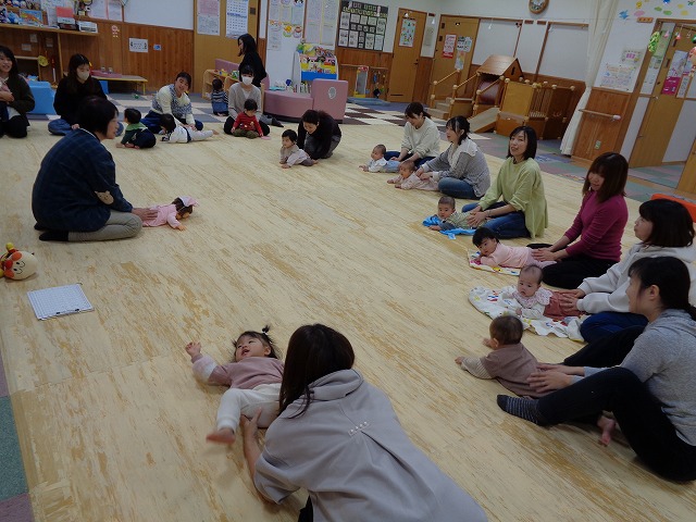 アンパンマンとタッチしてからふれあい遊びをしました。くすぐり遊びで“こちょこちょ”をしてもらってから背中のマッサージは触ってもらうと緊張もほぐれて、血流もよくなり体も温まります。そしてママのお膝に乗ってのユラユラ遊びはダイナミックに体を動かして刺激になりますね。