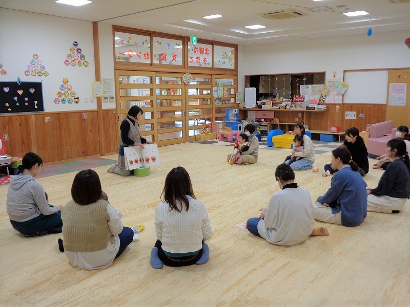 1月14日(水)に北御牧子育て支援センターでふれあいひろばが開催され、13組の親子の参加がありました。今回は「ふれあい遊びと紙で遊ぼう」の内容で行いました。