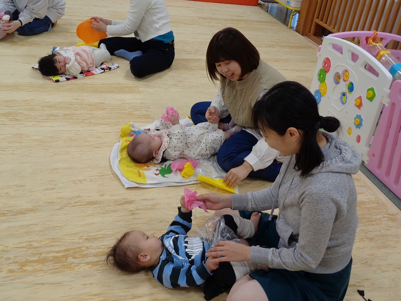寒くなると体が動きにくくなりますね。マッサージをしてあげると体が温まり寝返りやハイハイがしやすくなるので、優しく触って刺激をしてあげましょう。この日は♪「だいこん1本」のくすぐり遊びやママのお膝の上で遊ぶ♪「高い山低い山」で子どもたちの笑顔が見られましたよ。