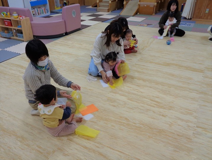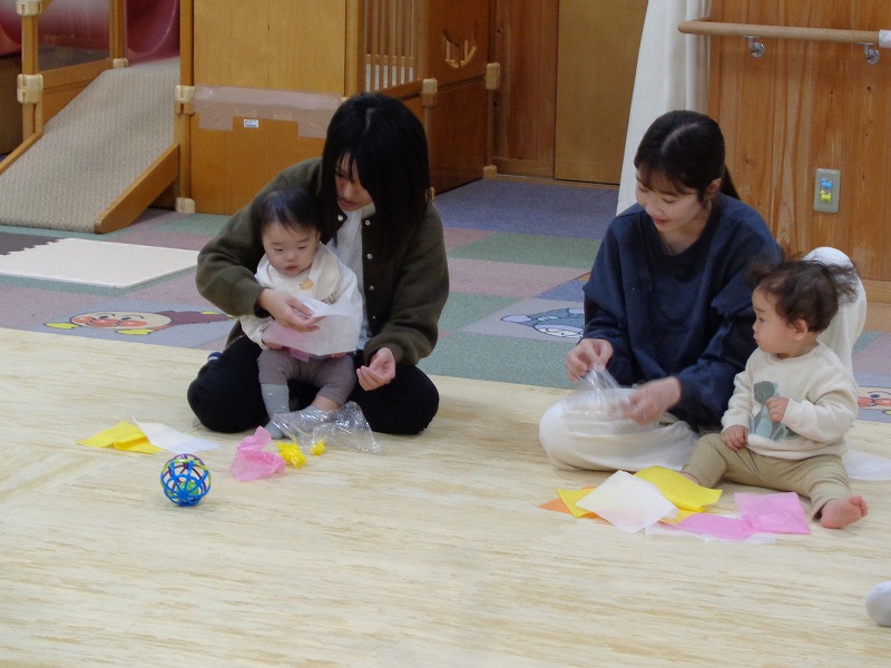 カラフルな色のお花紙をママと一緒につかんだり…破いたり…感触をあじわいました。遊んだ後はお花紙をビニール袋につめて紐をしばり、雪だるまの形の手に持つおもちゃの完成!子どもたちは“にぎにぎ”して遊んでいました。