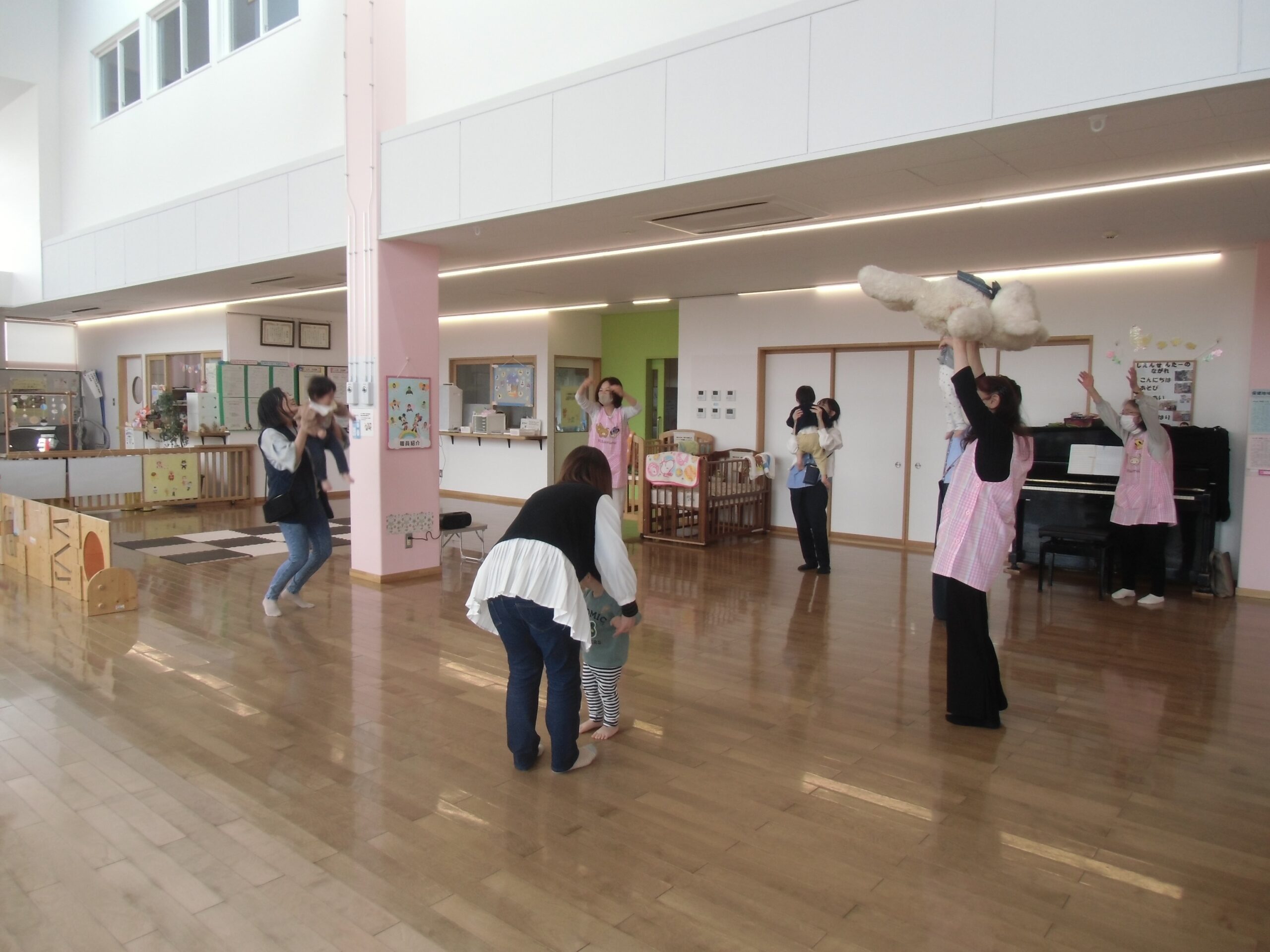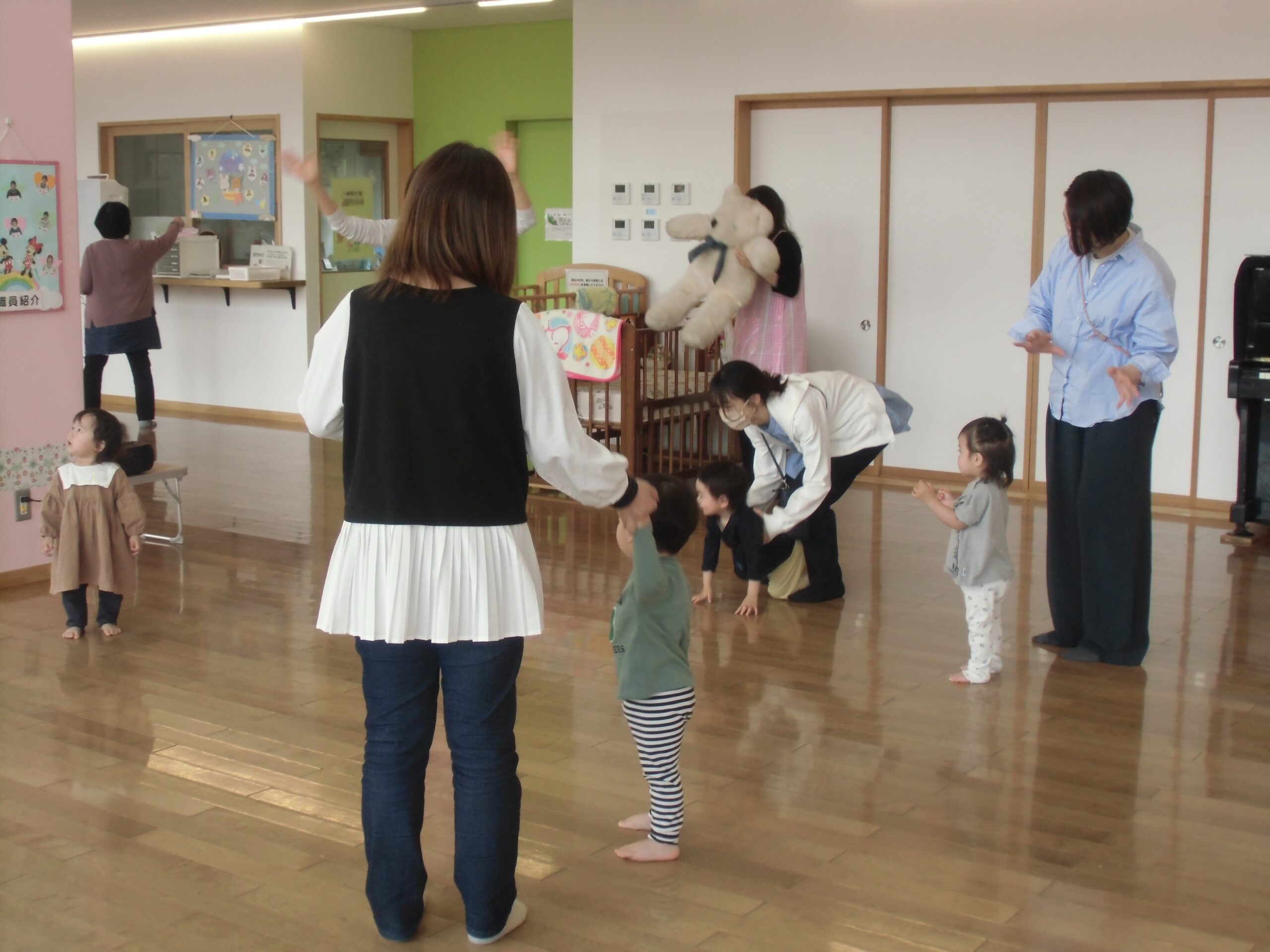 みんなでおしりをふりふり♪したり、真ん中に集まって「わっ!」と声を出したり、最後はお母さんやお父さんに高い高いをしてもらったり!にこにこしながらリズムにのって体操を楽しんでいましたよ♪