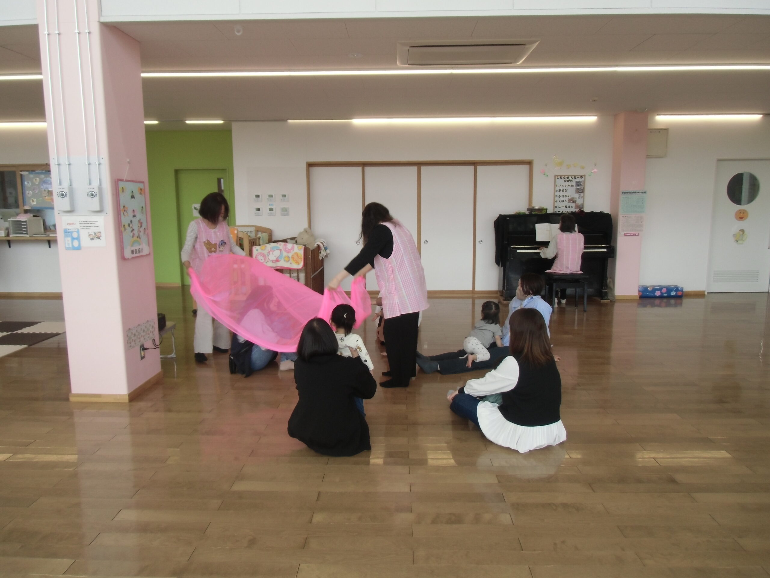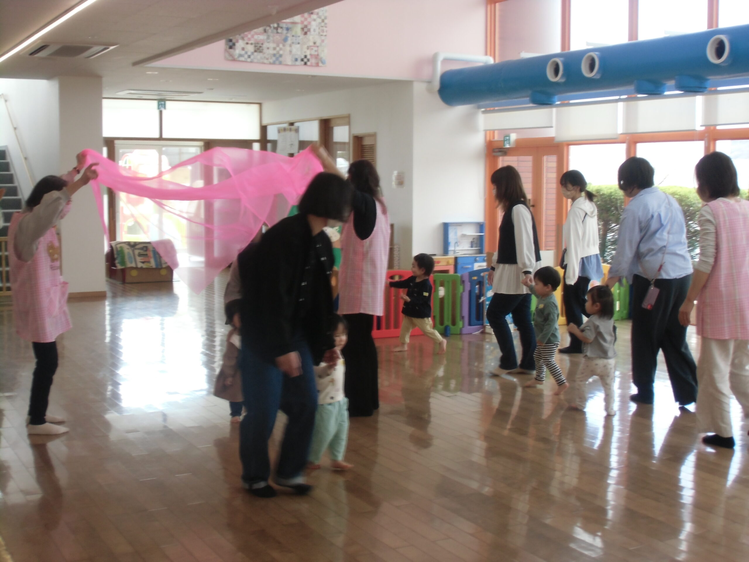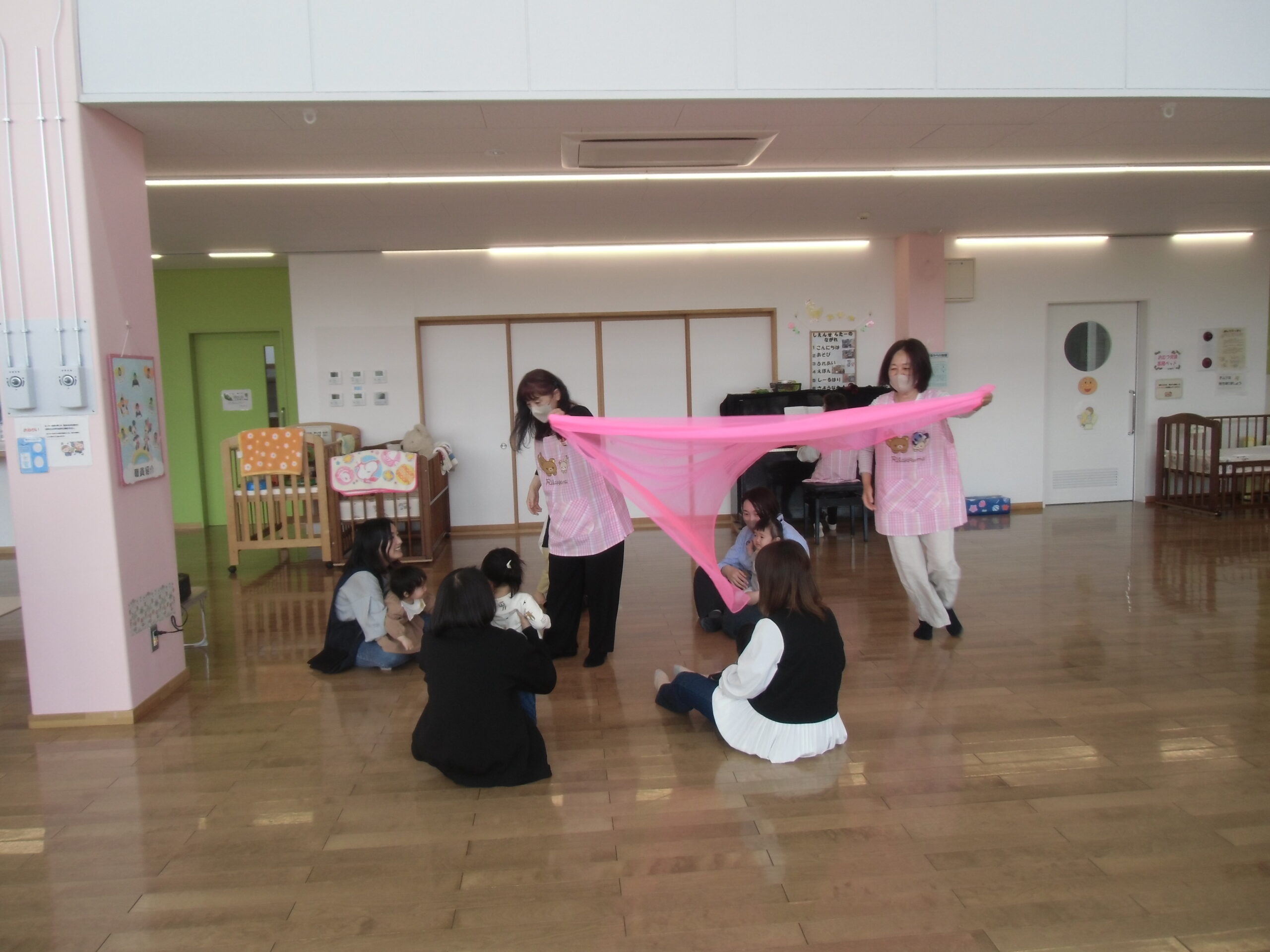 大きなフラーフが順番に親子の上をひらひらと移動して行きます。手を伸ばして触ろうとしたり、楽しくて「きゃー♪」と声を出したり♪最後はぴゅーっと速く上を通っていき、フラーフが触れるとみんなくすぐったそうにしていました♪
