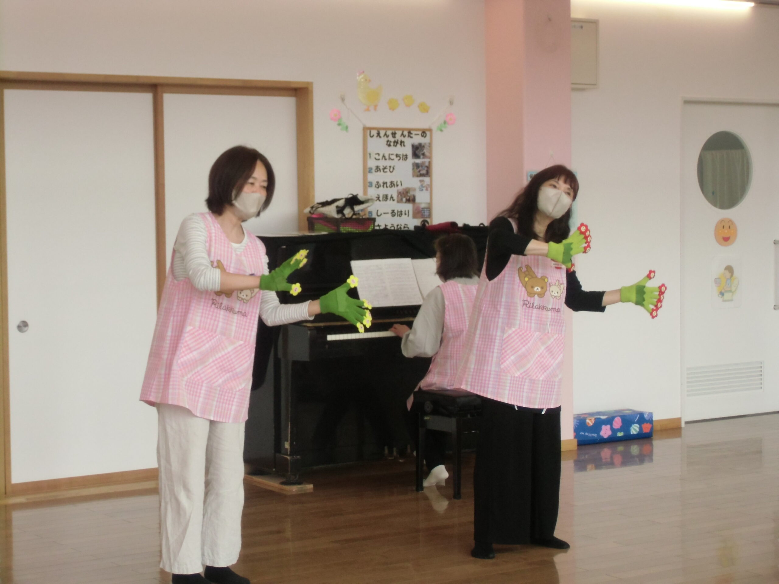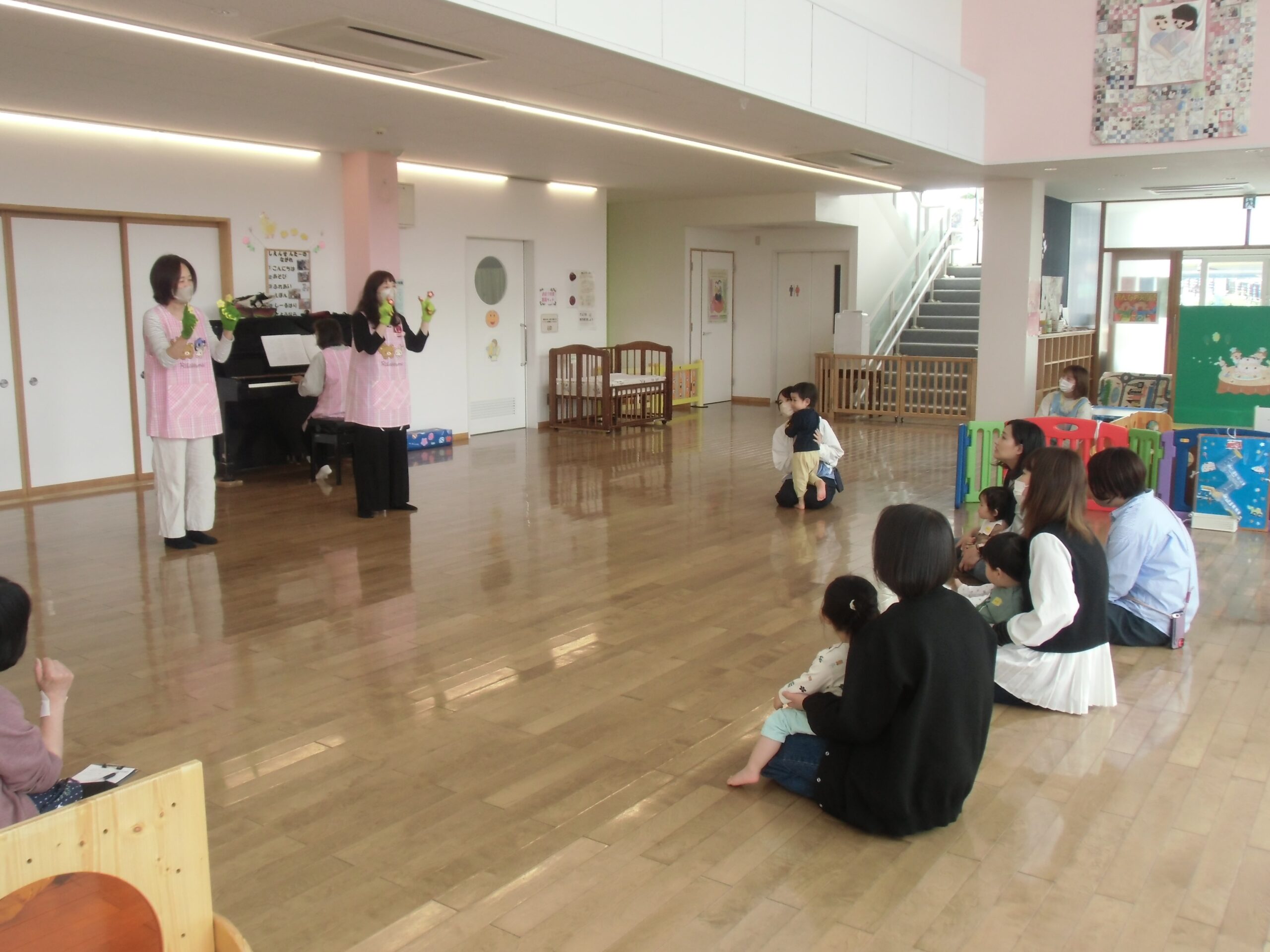 暖かくなってきてたくさんの草花が顔を出し始めてきましたが、支援センターにもお花がやってきました♪子どもたちも近くで見ましたが、少しびっくりしてお母さんにぎゅっとしがみつく子・興味を持ち手を伸ばす子など様々な反応を見せてくれました♪