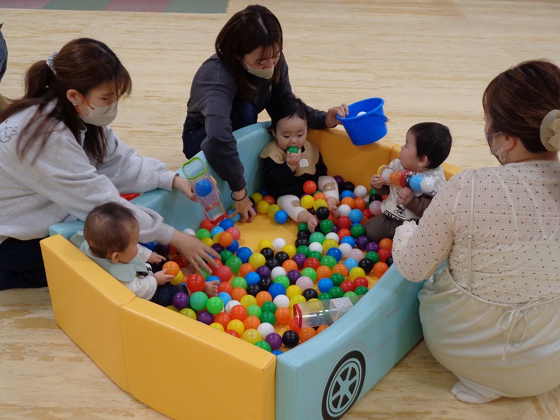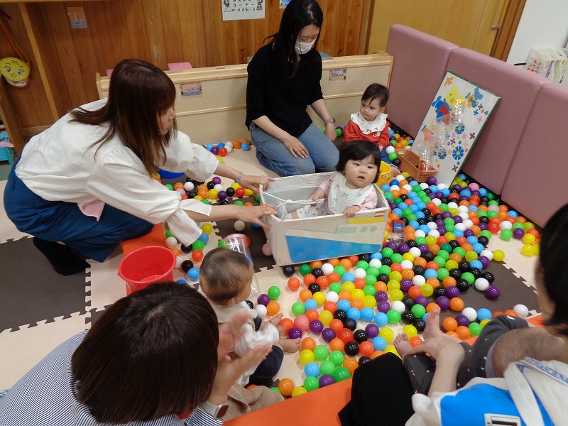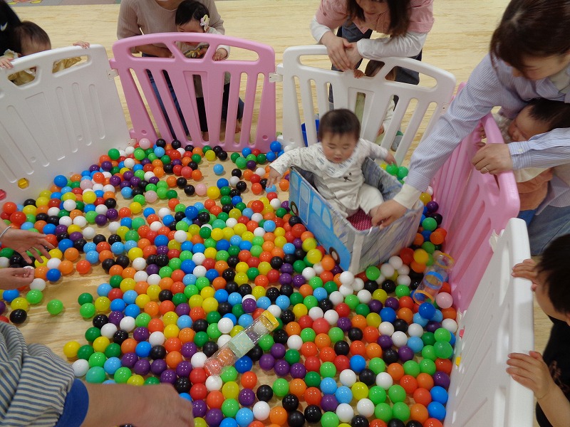 サークルやブーブークッションの中にカラフルなボールを入れて、うつ伏せで動き回ったり、つかんだり・・・目でボールをおって刺激をもらいながら感触を楽しみました。ママたちも子どもたちの目線にあわせて遊んでいました。