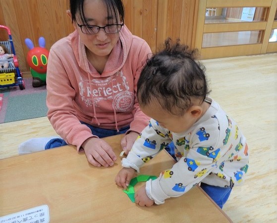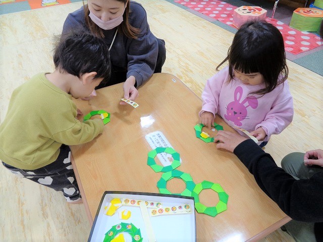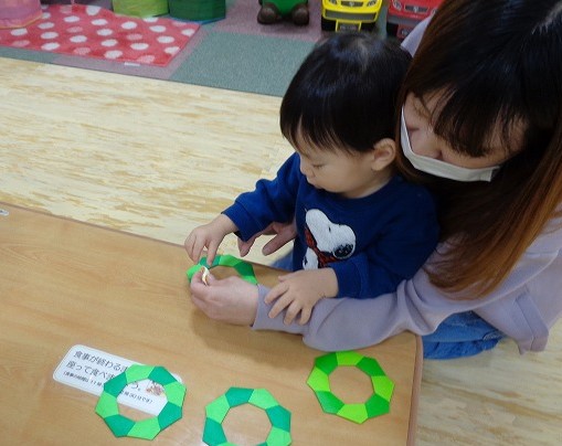 折り紙で作ったリースにシールを貼って完成。シール貼りが好きな子どもはペタペタと貼る事を楽しみながら作っています。小さい子どもたちは、ママが手を添えて一緒に貼ったり、貼っている行程や貼り付けたシールを見せたりしながら完成させていましたよ。出来上がったリースは、センター内の装飾として壁に飾り、12月の半ば頃には、お家でも飾って頂けるようにお渡しします。