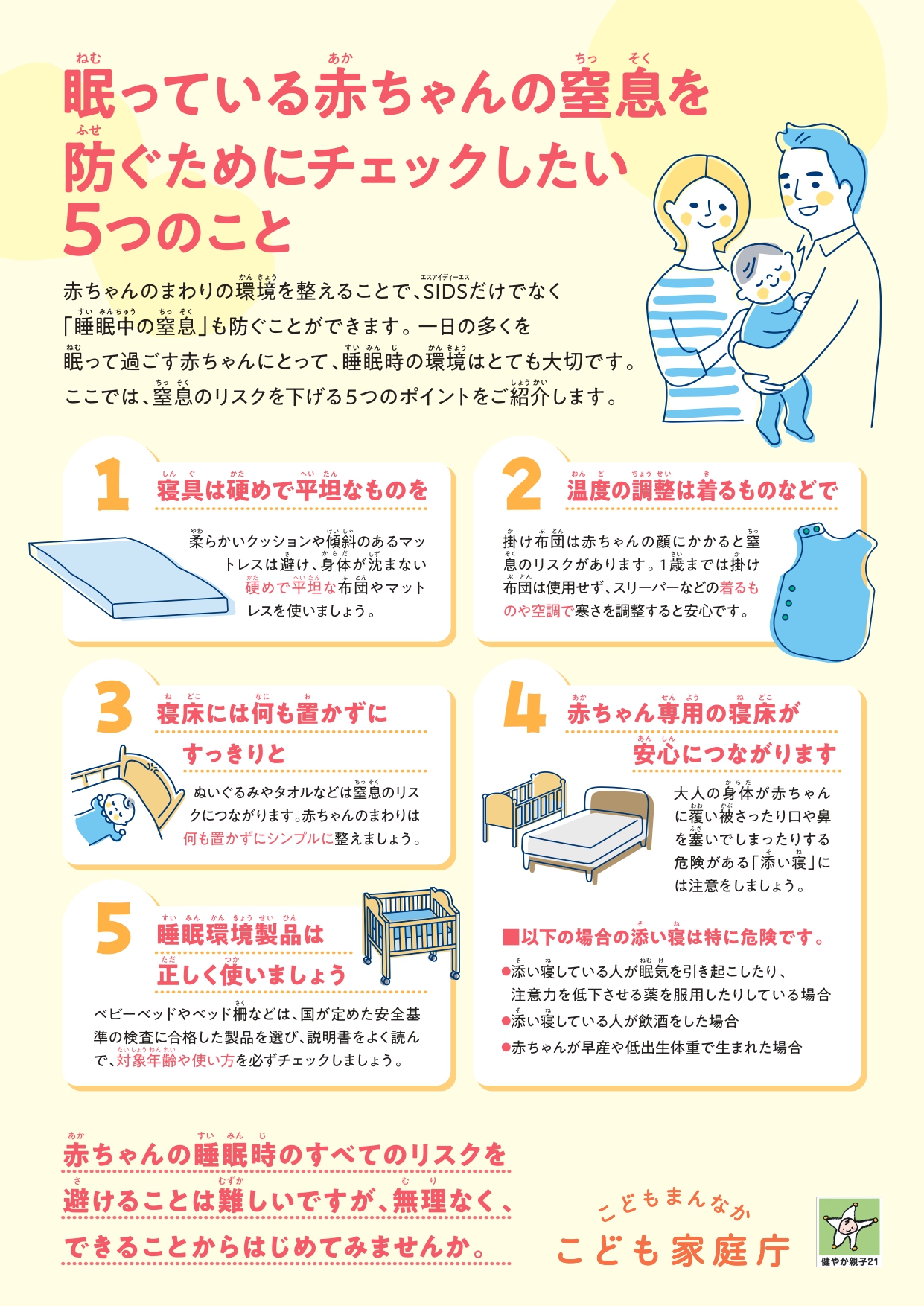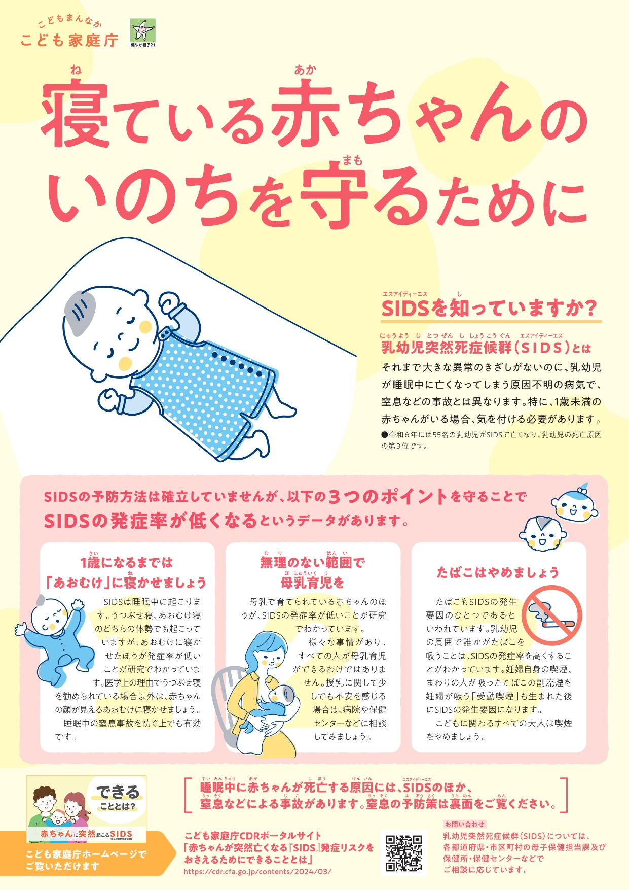 それまで大きな異常のきざしがないのに、乳幼児が睡眠中に亡くなってしまう原因不明の病気で、窒息などの事故とは異なります。特に、1歳未満の赤ちゃんがいる場合、気を付ける必要があります。